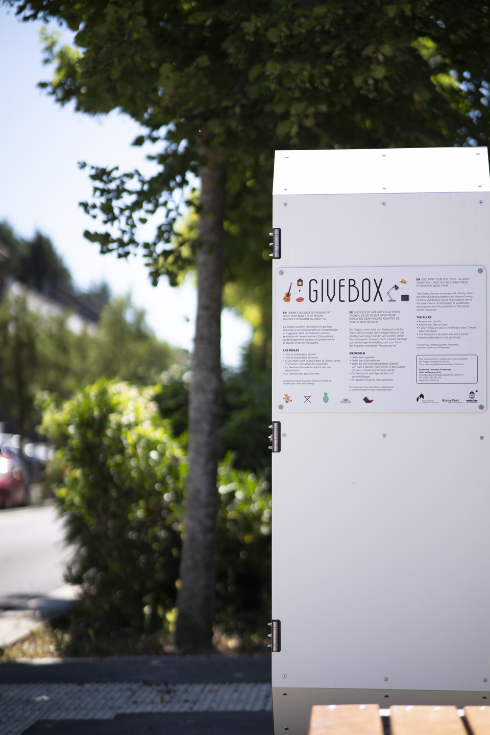 La GiveBox est un endroit simple où chacun·e peut déposer des objets dont il ou elle n’a plus besoin, afin que d’autres personnes puissent les récupérer gratuitement. Cela permet de donner une seconde vie à des objets et d’éviter de jeter des choses encore utiles.